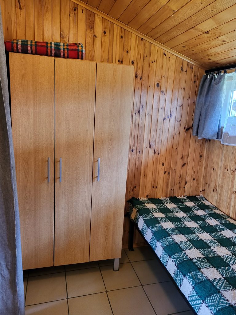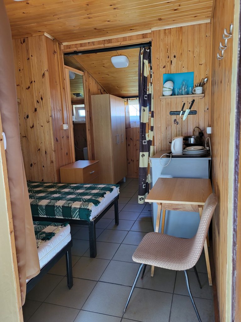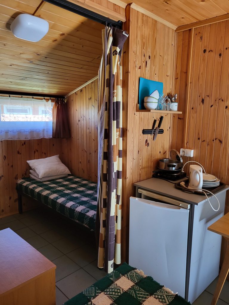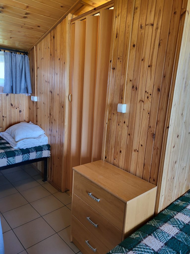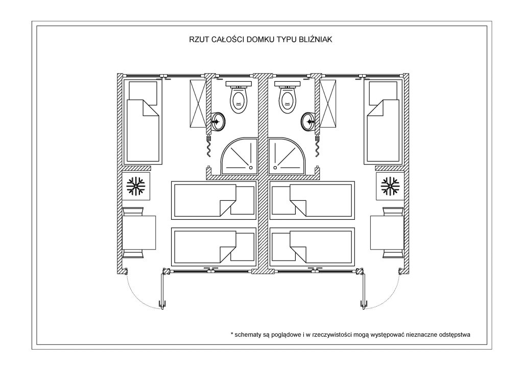 W domkach bliźniakach znajdują się trzy pojedyncze łóżka (dwa obok siebie z możliwością połączenia), stolik, krzesła, szafa, lodówka, czajnik, kuchenka elektryczna jednopalnikowa oraz podstawowe naczynia. Domki wyposażone są w łazienkę z prysznicem, umywalką i toaletą. Przed domkiem znajduje się stół oraz ławka, możliwość grillowania.