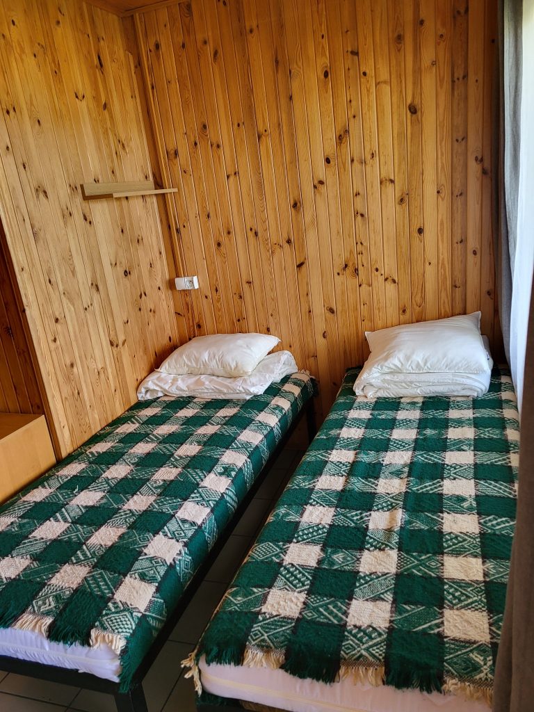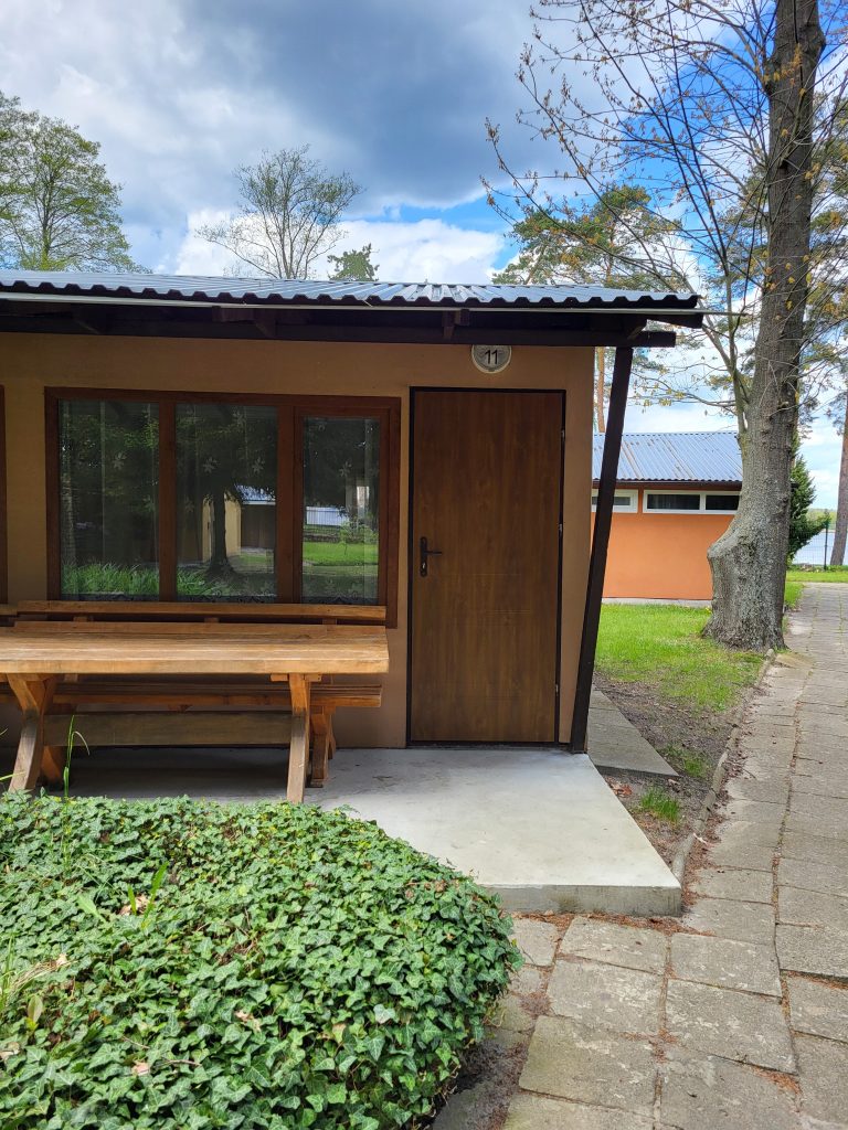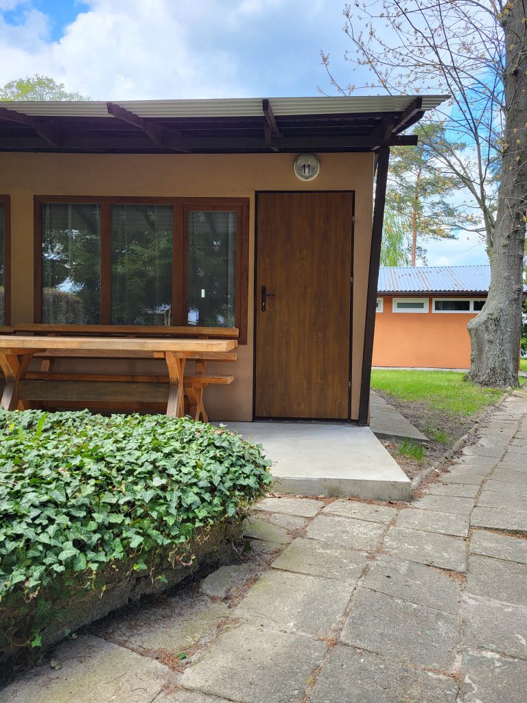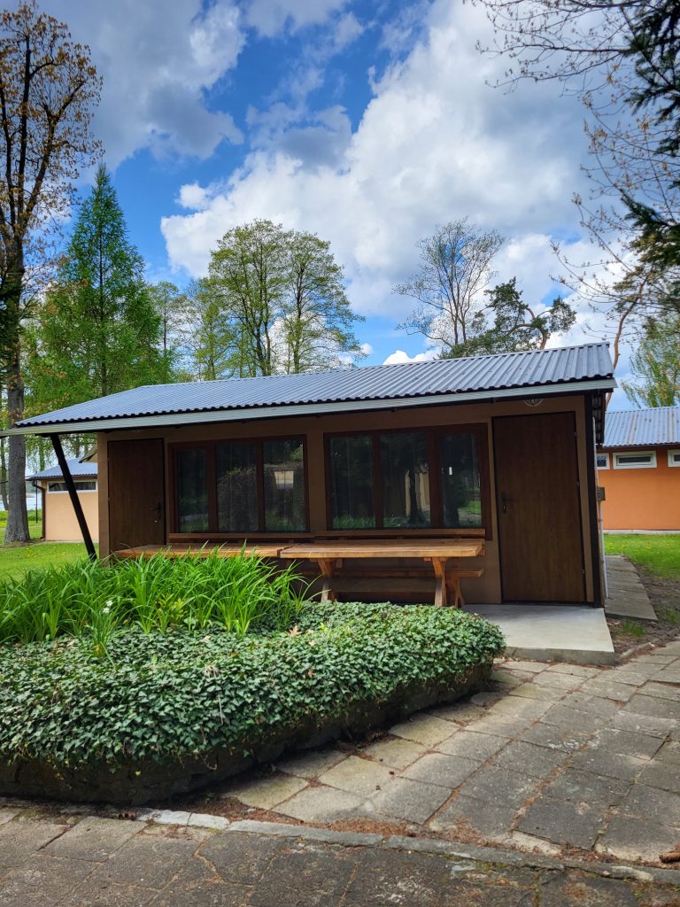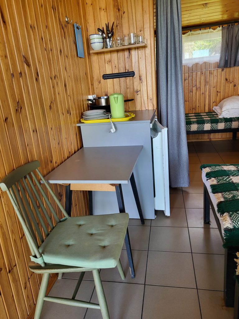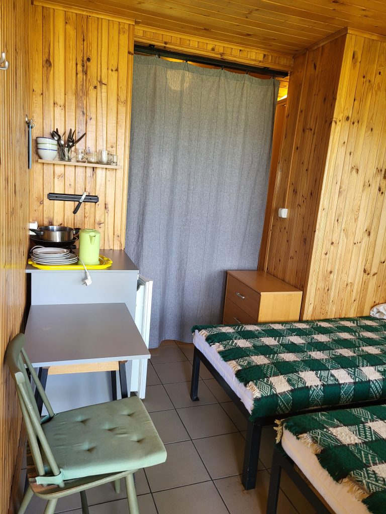 W domkach bliźniakach znajdują się trzy pojedyncze łóżka (dwa obok siebie z możliwością połączenia), stolik, krzesła, szafa, lodówka, czajnik, kuchenka elektryczna jednopalnikowa oraz podstawowe naczynia. Domki wyposażone są w łazienkę z prysznicem, umywalką i toaletą. Przed domkiem znajduje się stół oraz ławka, możliwość grillowania.