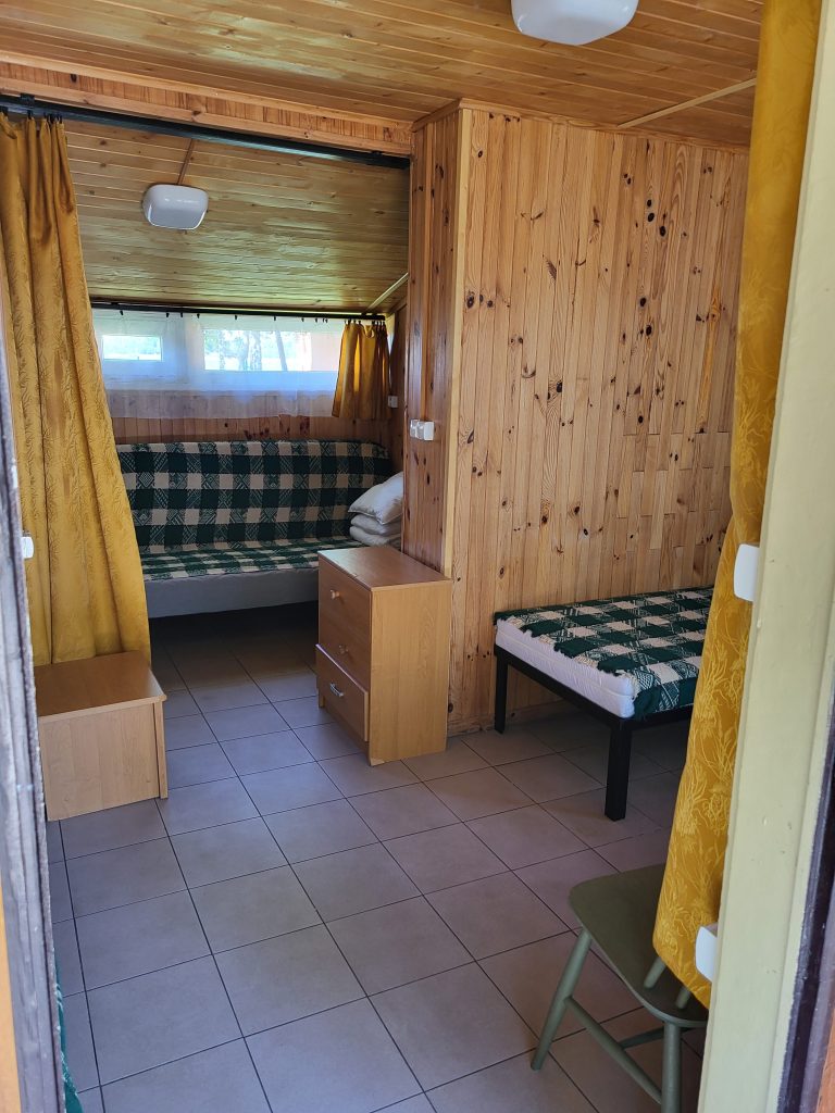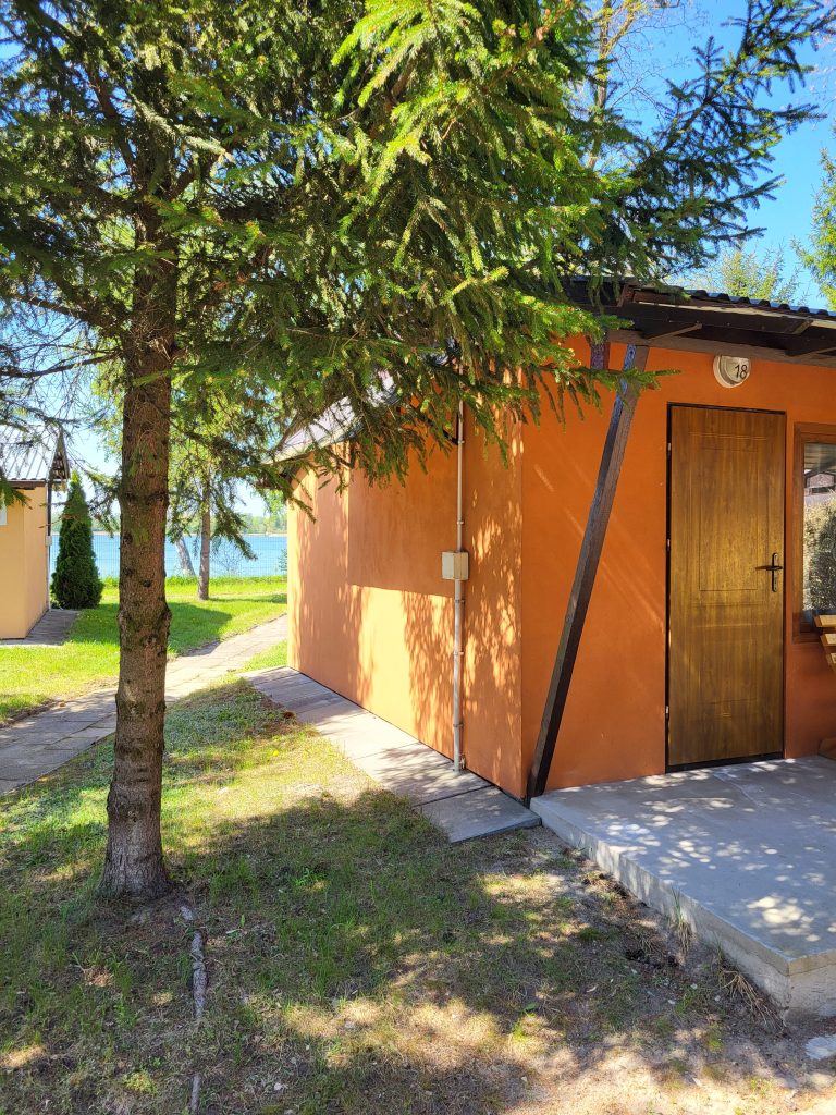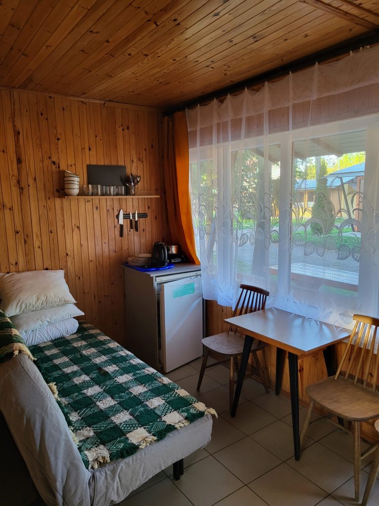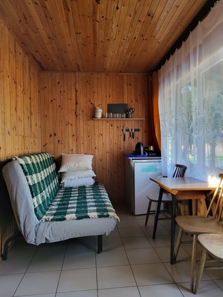 W domkach wolnostojących znajduje się jedna dwuosobowa kanapa oraz trzy łóżka jednoosobowe, stolik, krzesła, szafa, lodówka, czajnik, kuchenka elektryczna jednopalnikowa oraz podstawowe naczynia. Domki wyposażone są w łazienkę z prysznicem, umywalką i toaletą. Przed domkiem znajduje się stół oraz ławka, możliwość grillowania.