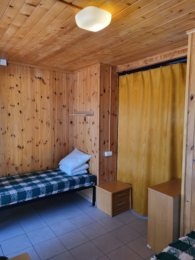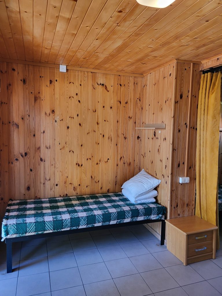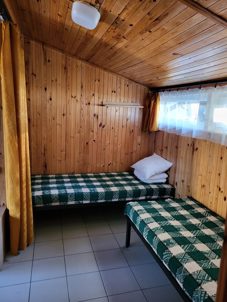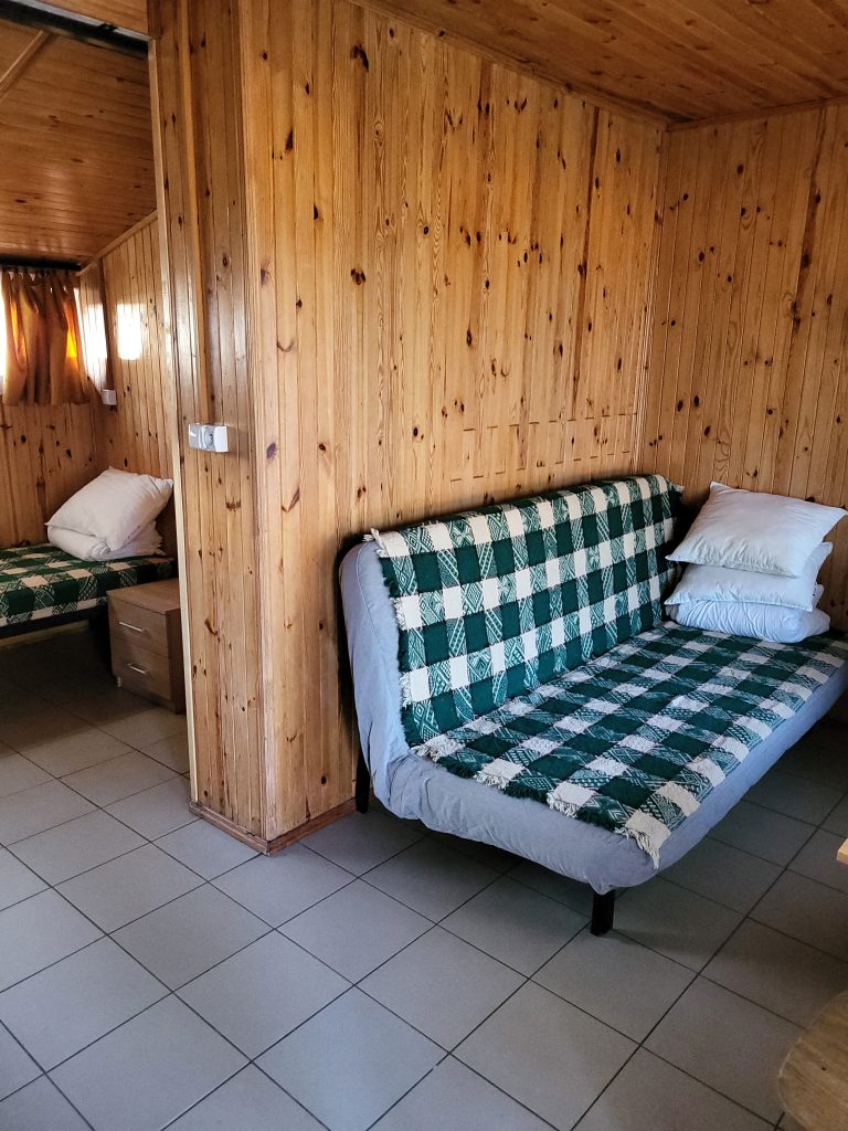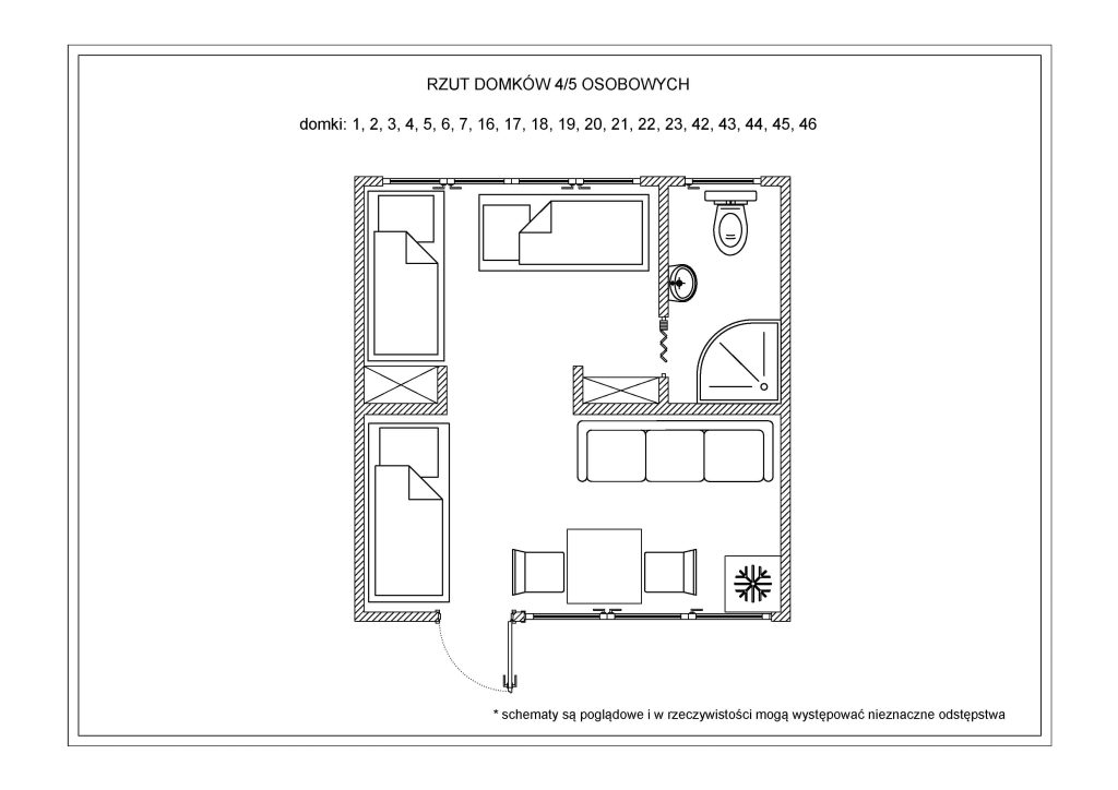 W domkach wolnostojących znajduje się jedna dwuosobowa kanapa oraz trzy łóżka jednoosobowe, stolik, krzesła, szafa, lodówka, czajnik, kuchenka elektryczna jednopalnikowa oraz podstawowe naczynia. Domki wyposażone są w łazienkę z prysznicem, umywalką i toaletą. Przed domkiem znajduje się stół oraz ławka, możliwość grillowania.